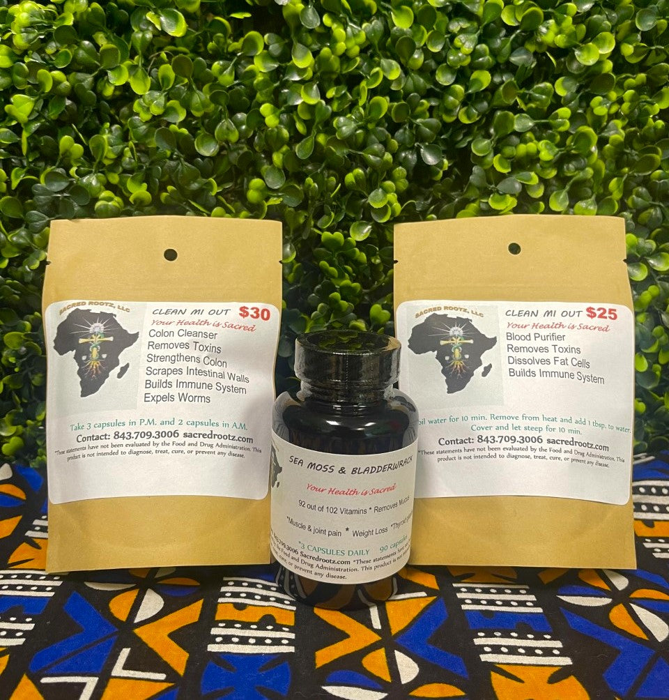 Here at Sacred Rootz we offer one of our best-selling detox formulas “Clean Mi out” detox. Great for colon flush, strengthens intestinal walls, scraps dried fecal matter off your walls, and acts as a conditioner to the colon without feeling uncomfortable. It’s a 3-part package which comes with chelation capsules to cleanse the cells of the body. Also, the Clean Mi out blood purifier tea great for removing toxins out of the blood, liver, kidneys, bladder, pancreas, and gallbladder. The tea is also good for weight loss as it dissolves fat cells, regulates blood sugar levels, and boost immune system. When detoxing the body of impurities, you always want to replenish the cells with the proper nutrients, so we also give you our powerful greenlight formula or Sea Moss & Bladderwrack capsules.